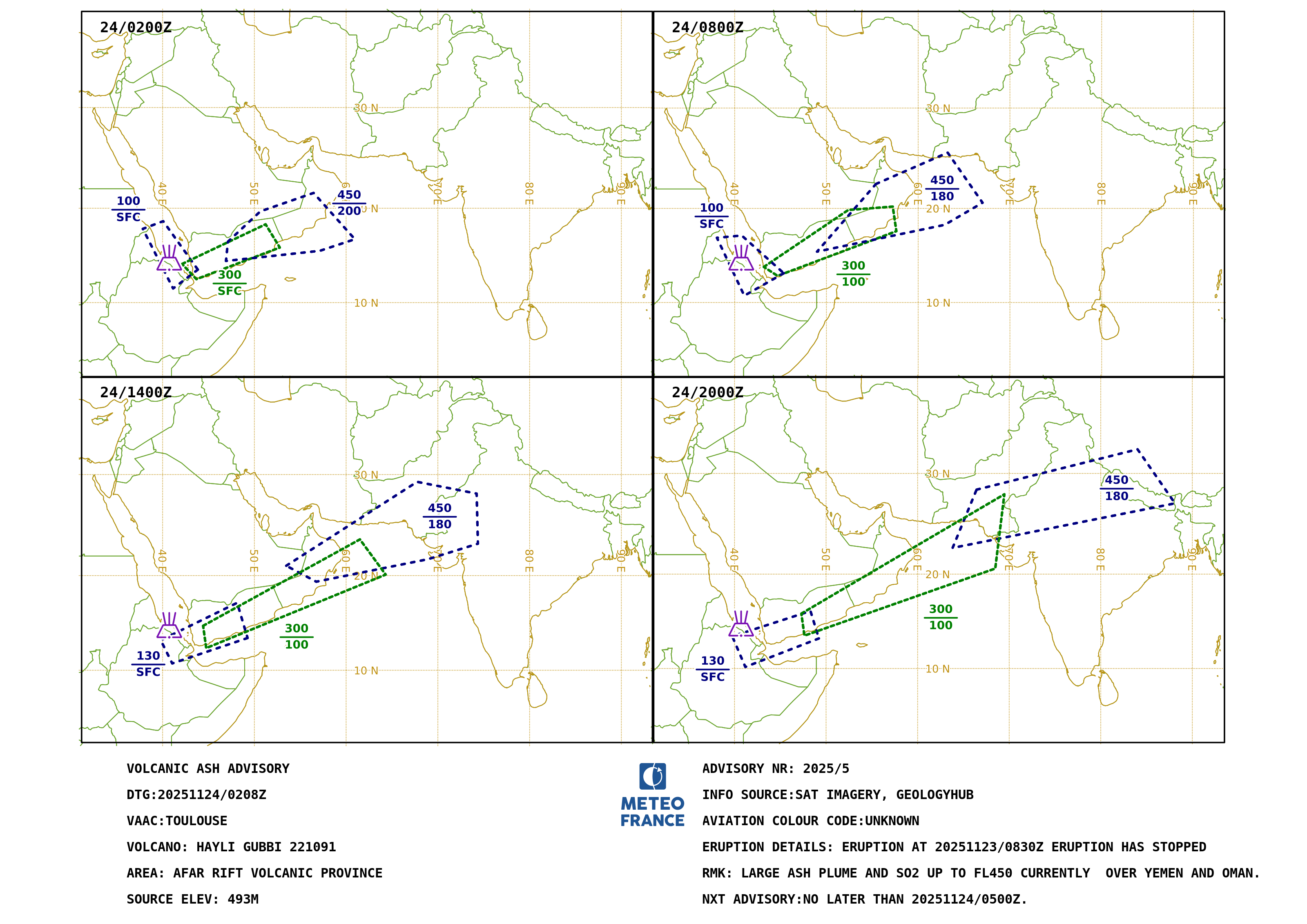 FCST VA CLD +6 HR: 24/0800Z SFC/FL100 N1309 E04521 - N1042 E04103 - N1654 E03803 - N1709 E04045 - N1309 E04521 FL100/300 N1348 E04309 - N1951 E05224 - N2012 E05715 - N1736 E05736 - N1251 E04439 - N1348 E04309 FL180/450 N2230 E05524 - N2539 E06312 - N2036 E06700 - N1818 E06254 - N1527 E04900 - N2230 E05524