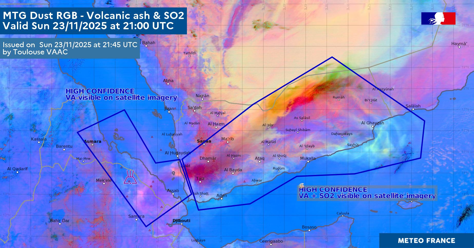 RMK: LARGE ASH PLUME AND SO2 UP TO FL500 CURRENTLY OVER YEMEN. LOWER PLUME STILL VISIBLE OVER ETHIOPIA. QVA CONCENTRATIONS MAY BE OVERESTIMATED IN THE LOWER LEVELS.